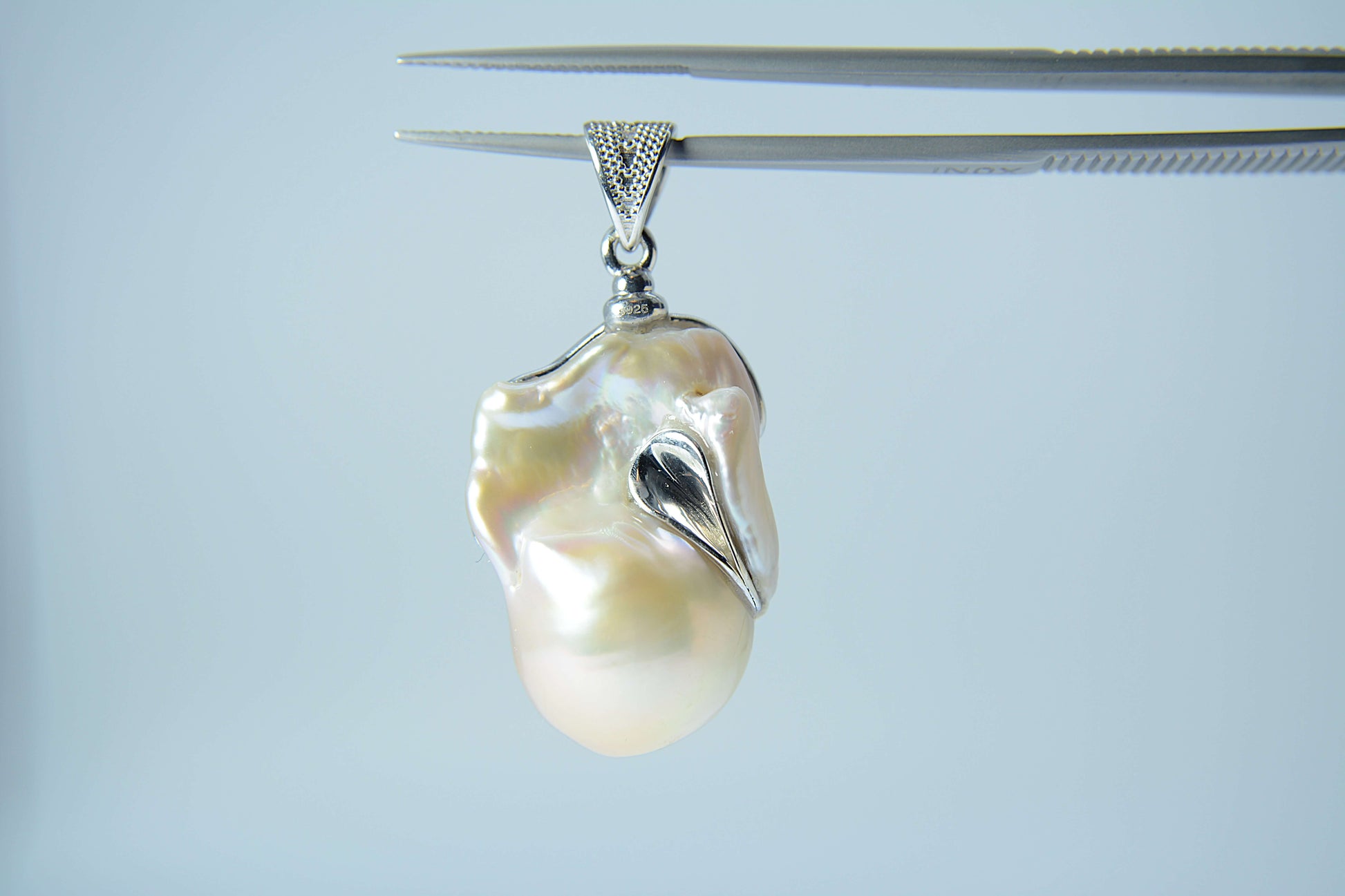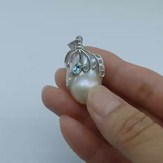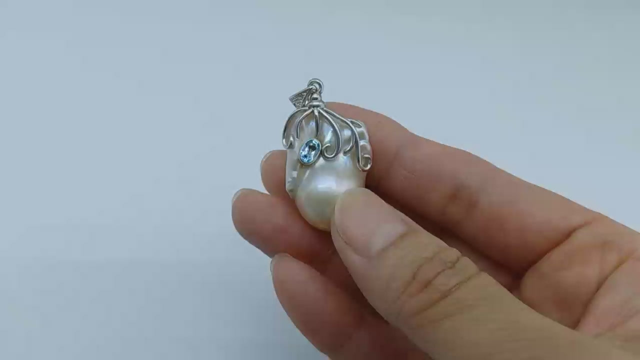 This stunning baroque pearl is capped with a fancy, hand-crafted pattern featuring a blue, high clarity Topaz