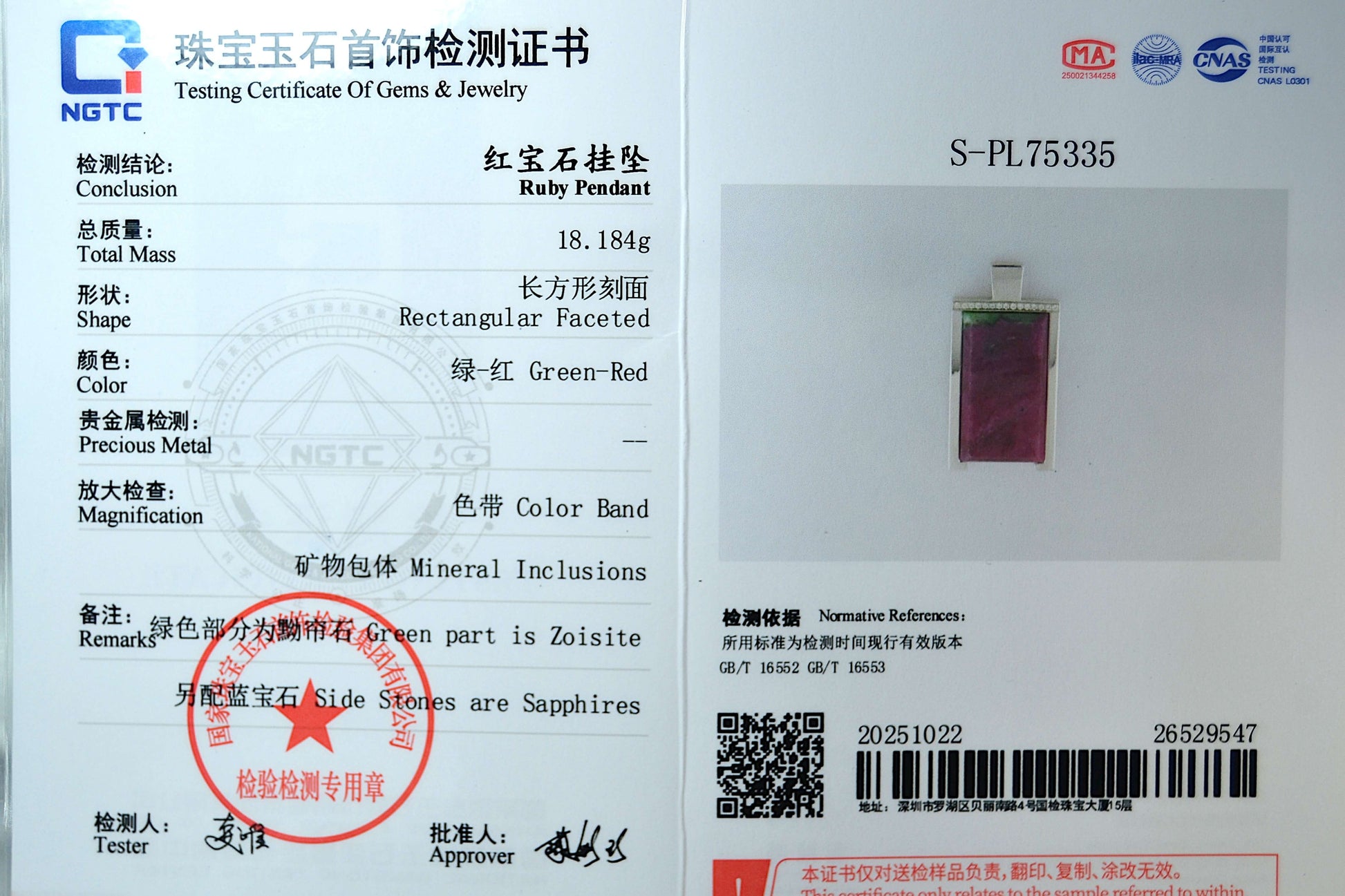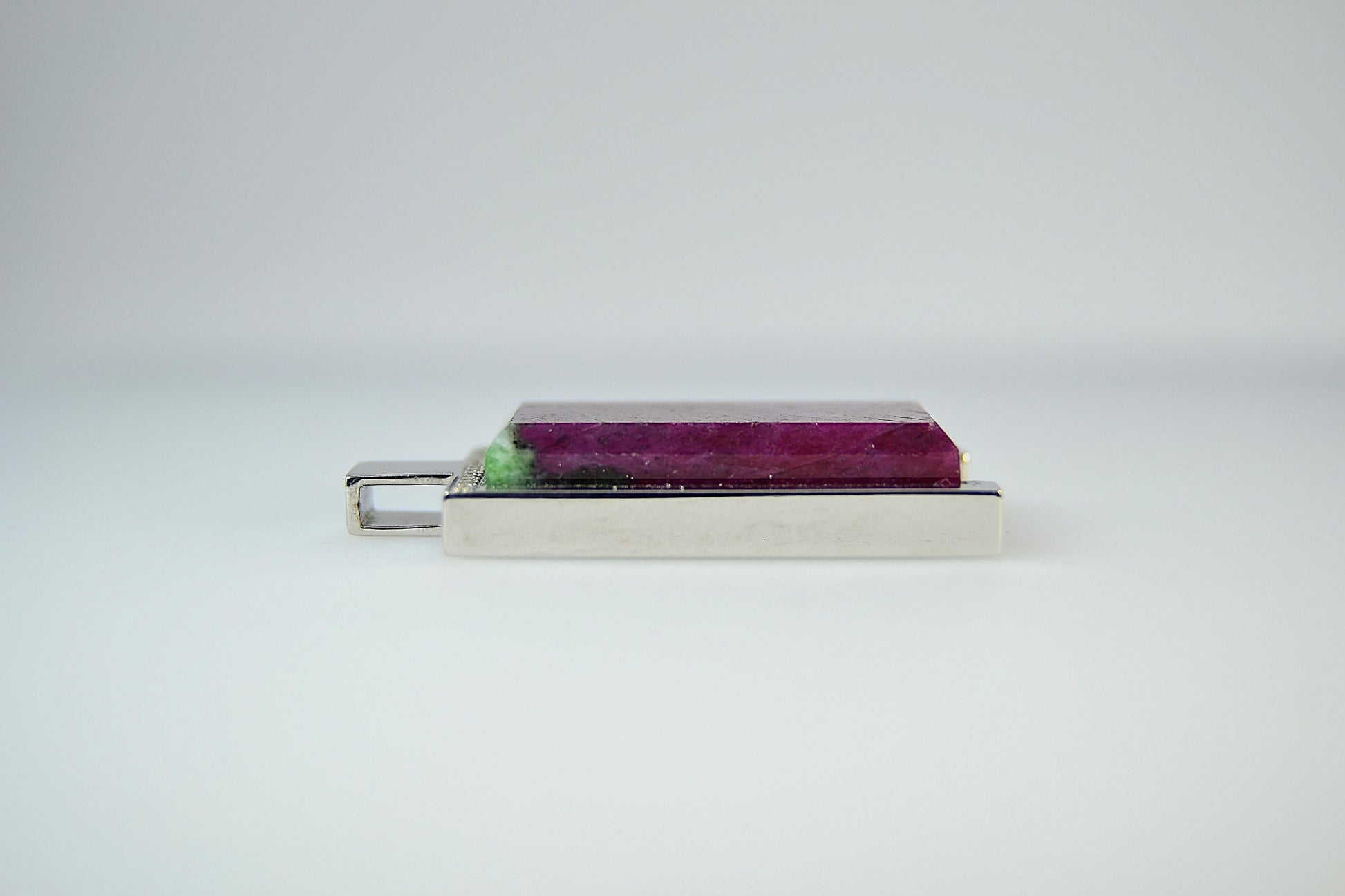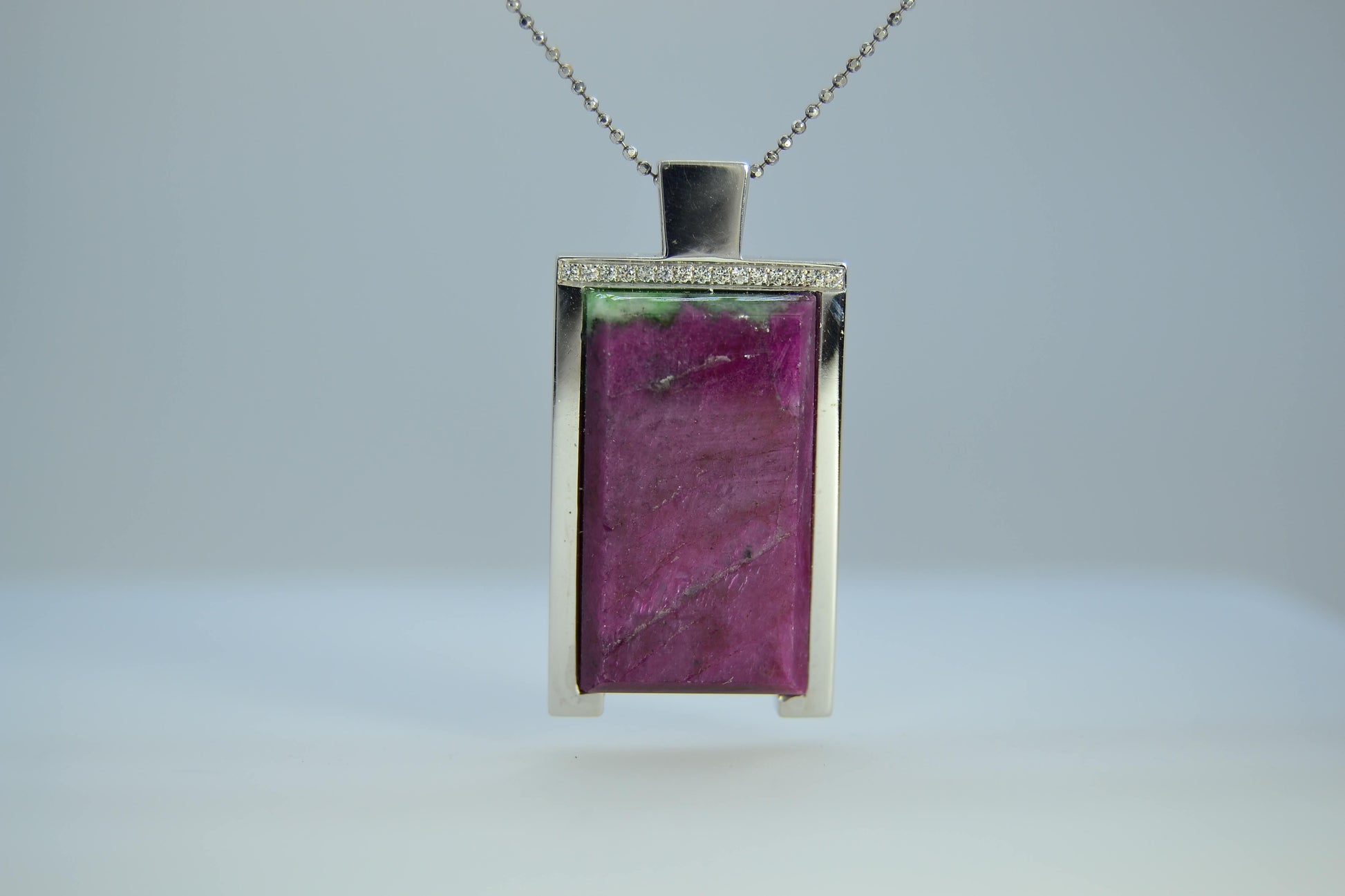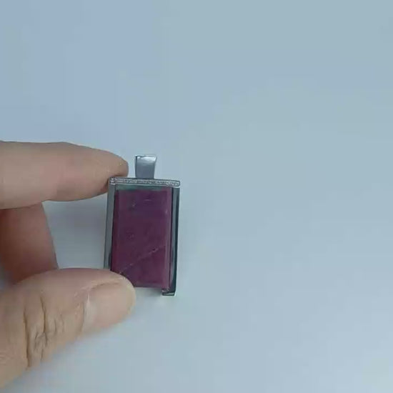 Ruby is one of the traditional gem gifts. This masculine-style pendant is set with a row of 15 pieces glowing Sapphires and a thick Ruby with distinct angular striations on both sides; which is encased in a frame. Together with the other piece of feminine-style Ruby pendant in my shop; appears to be a natural match and an ideal gem gift for your loved ones