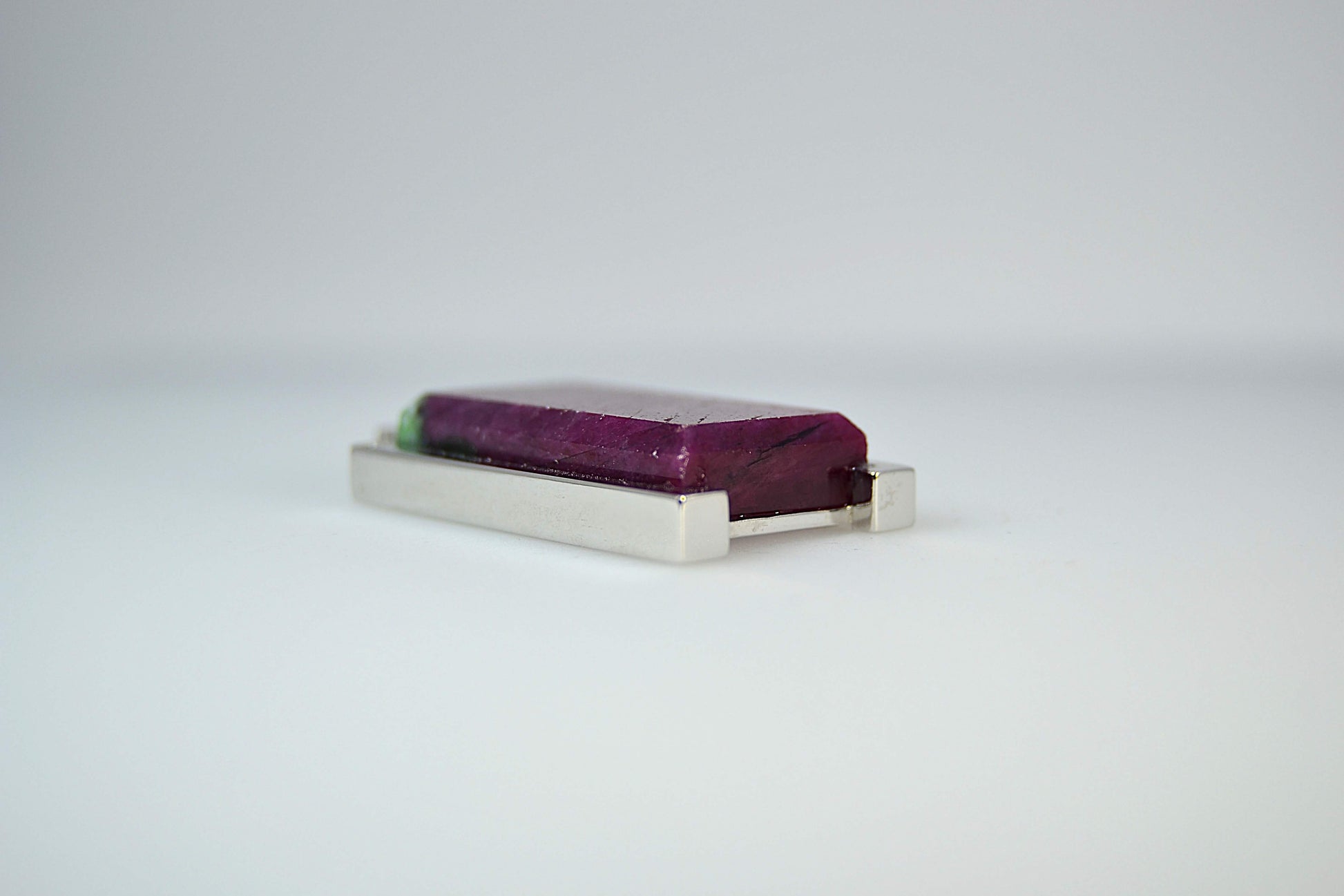 Ruby: 51.81 carats, purplish red, green, faceted rectangular