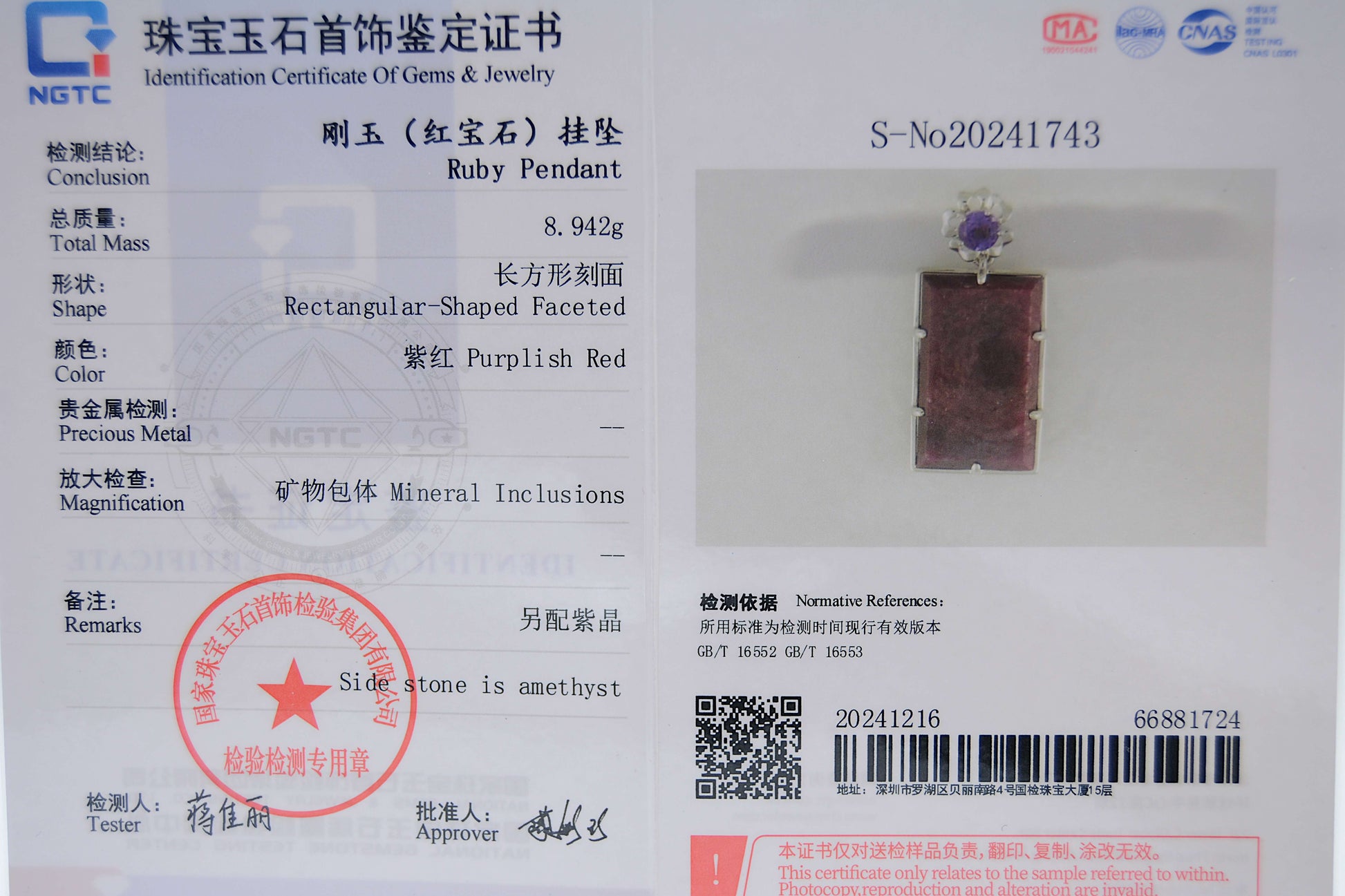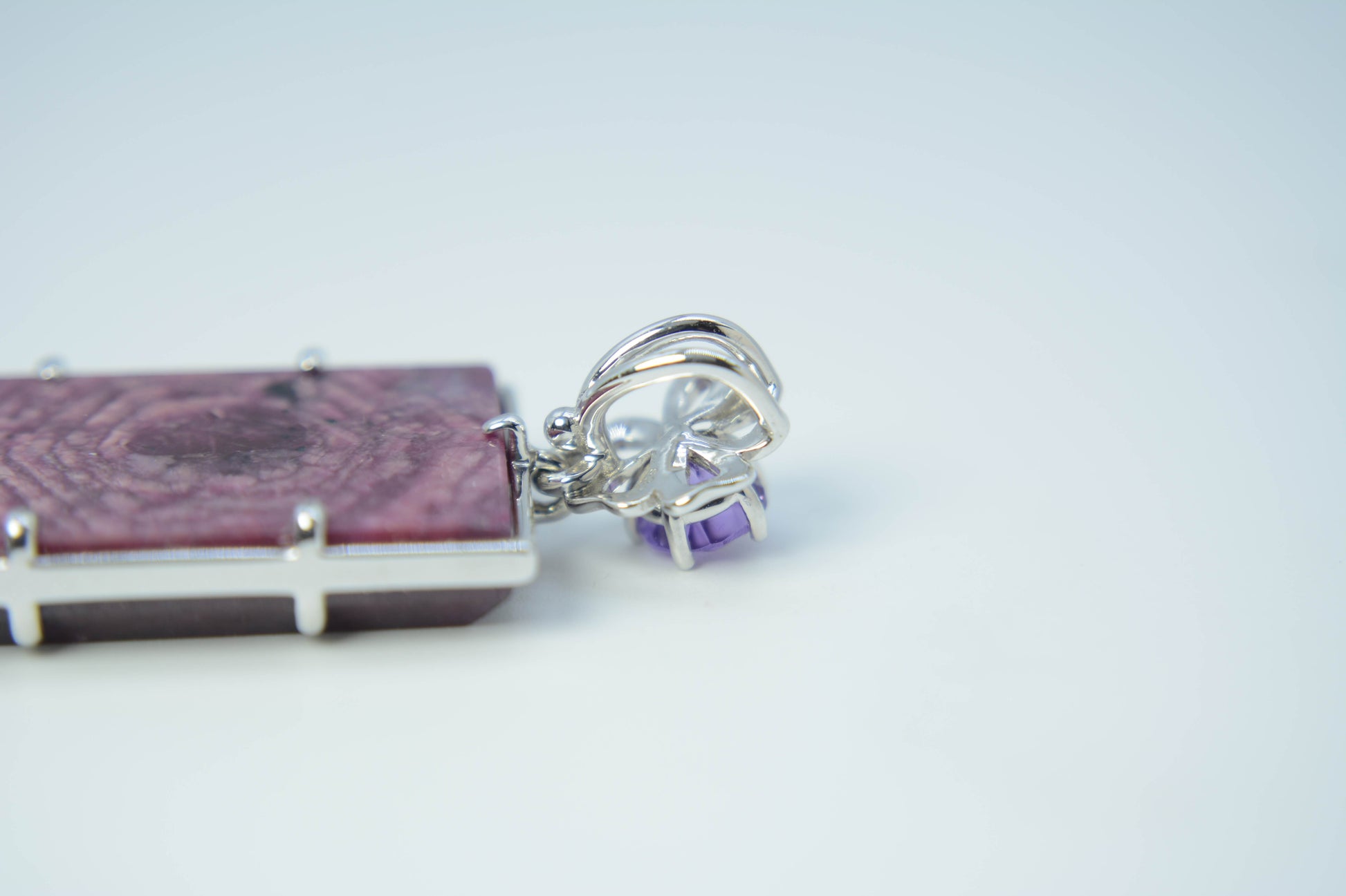 A spectacular ruby pendant with hexagonal striations on both sides; and an Amethyst of high clarity is set in a petal bail