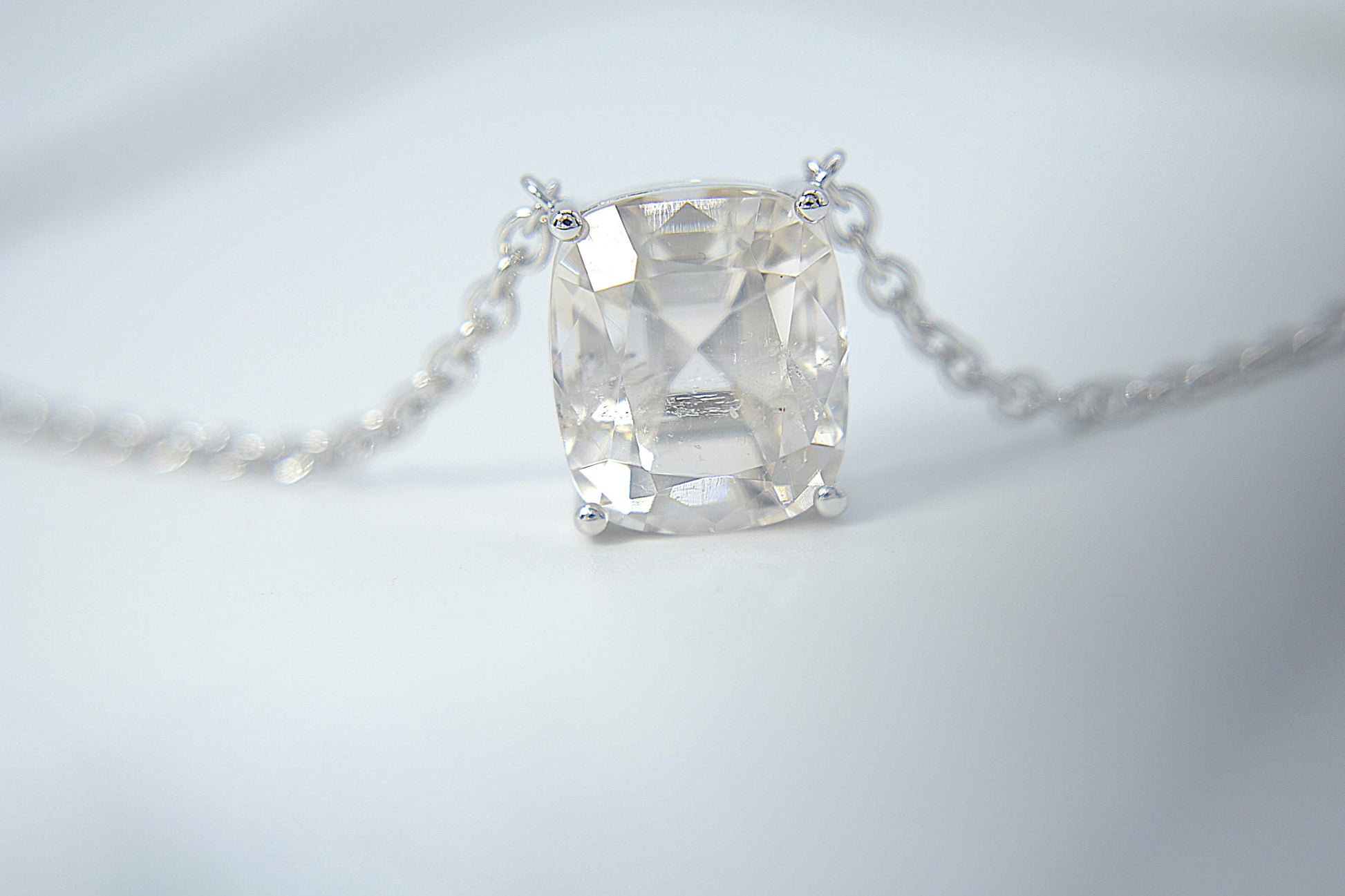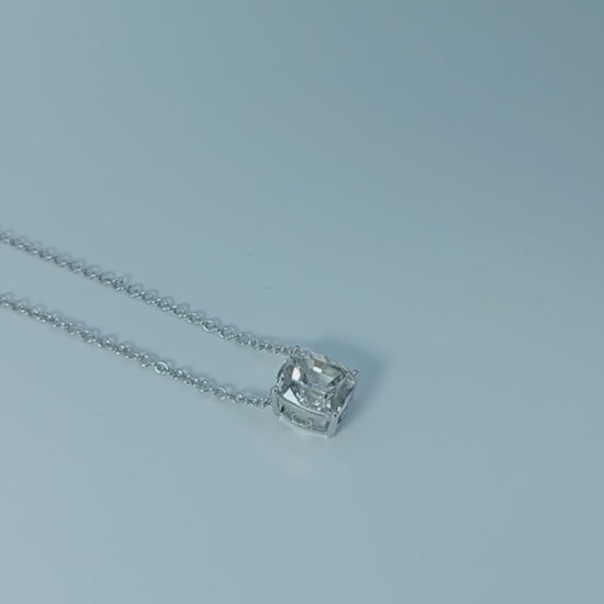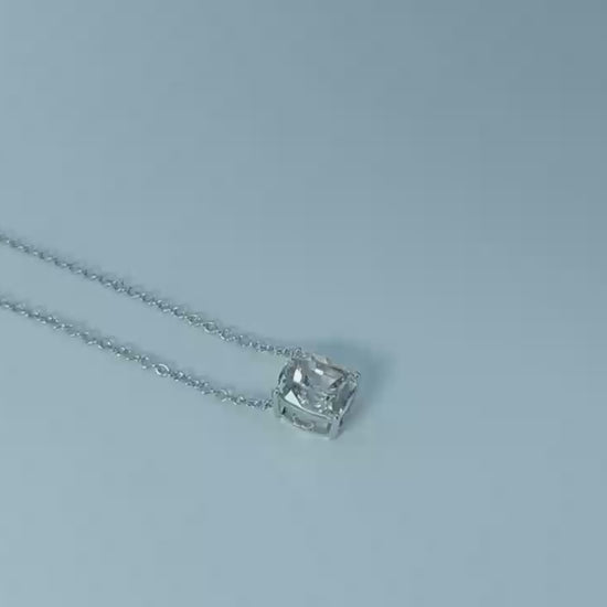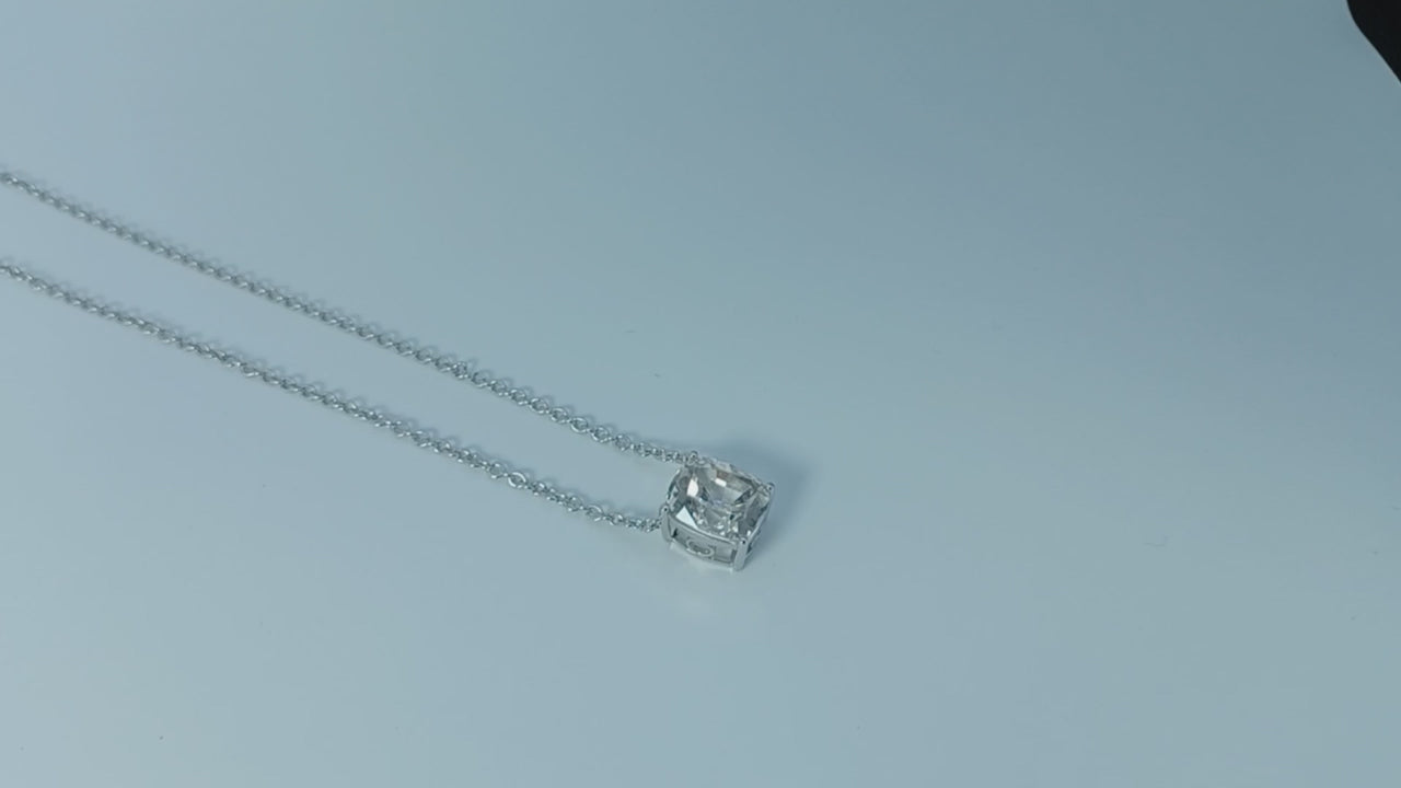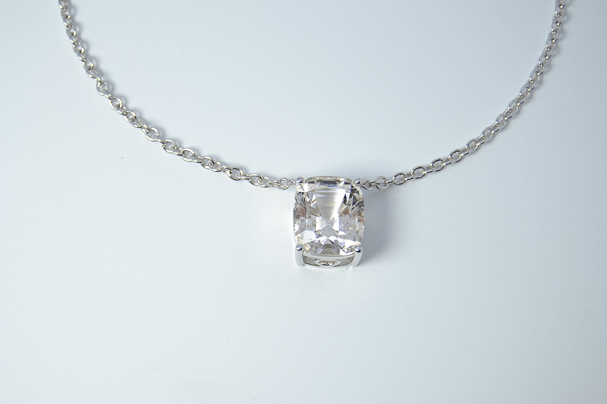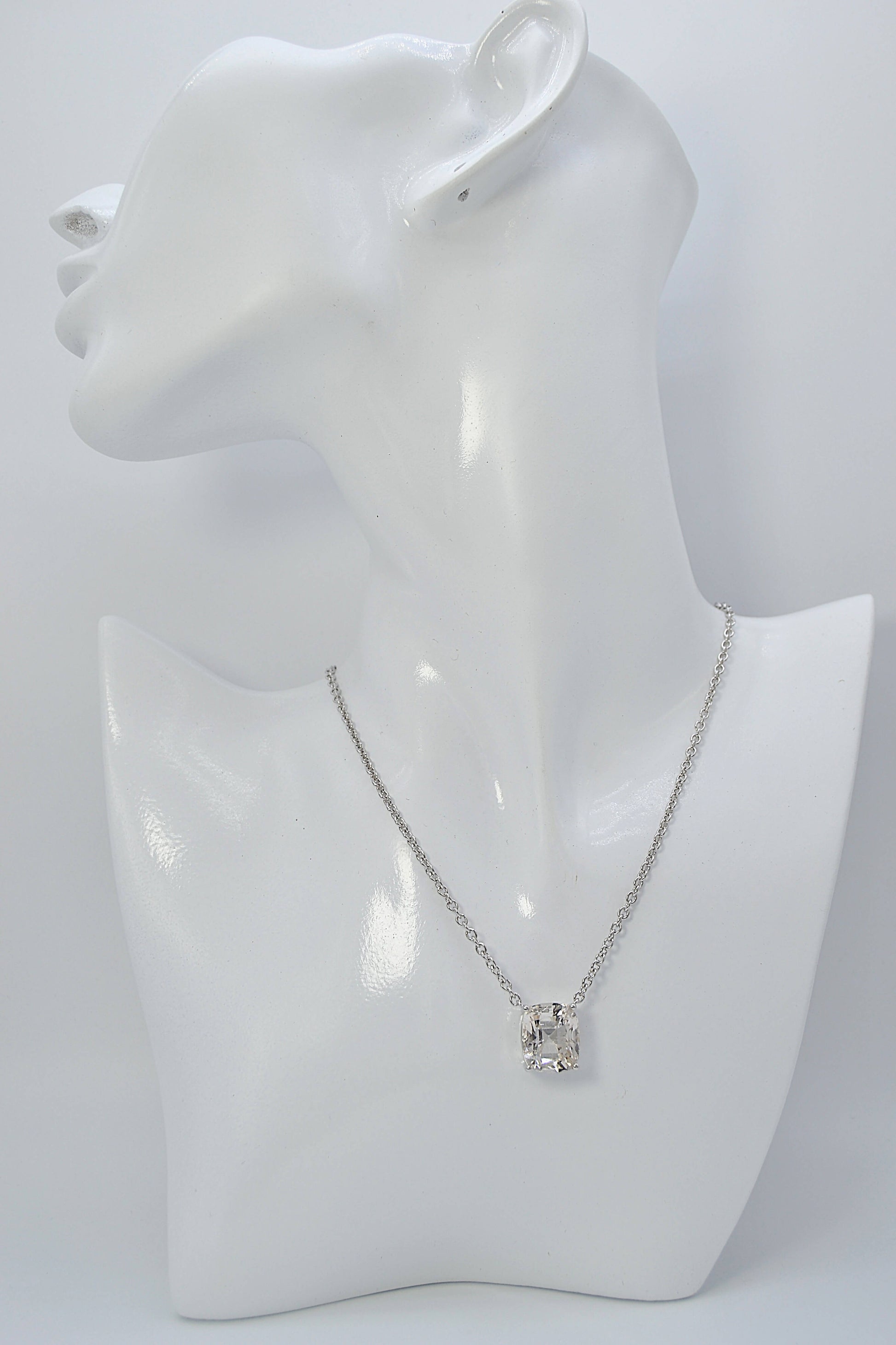 Originally part of a 46.5-carat rough stone from which this stunning 13.207-carat Topaz is superbly cut and faceted; round-cornered, to bring out the intense brilliance. This Topaz is suspended on a 18-inch Rhodium plated Sterling Silver necklace