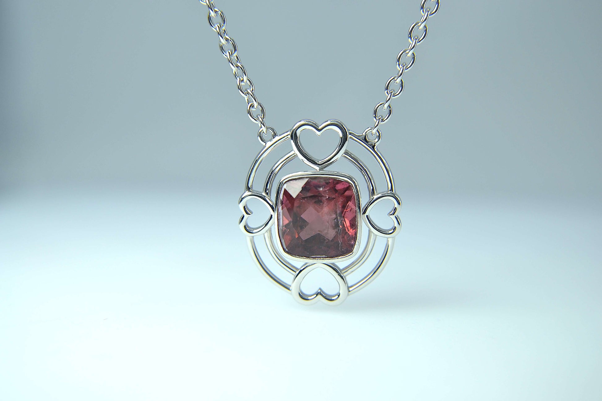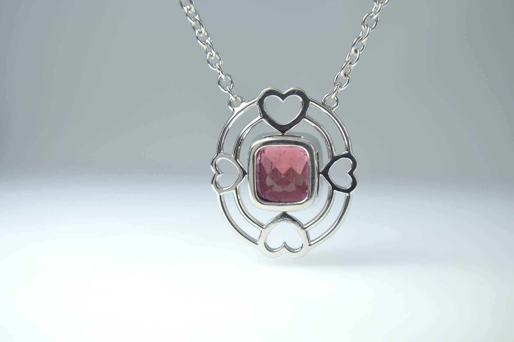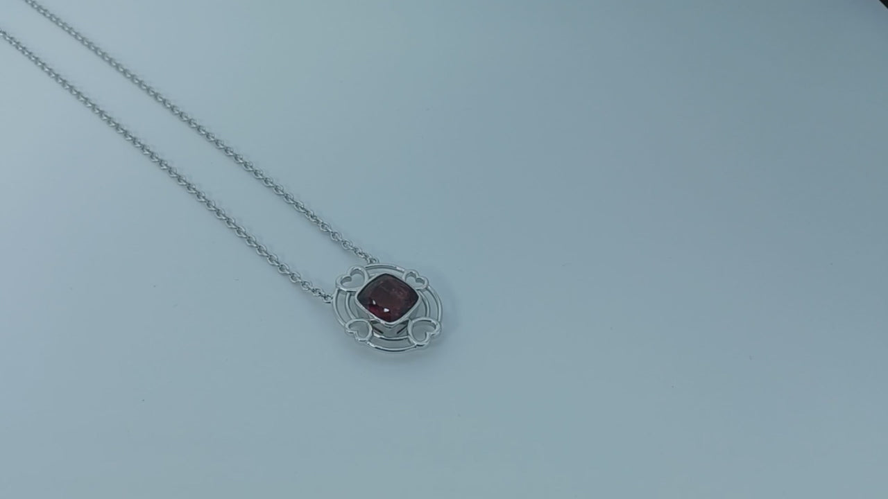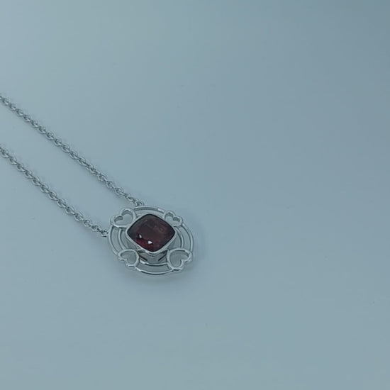 A lovely crafted art piece consists of four hearts, double bands patterns framing a 5.57-carat, rich colouration, orangey pink red Tourmaline, of which completing this 18-inch Rhodium plated sterling silver necklace